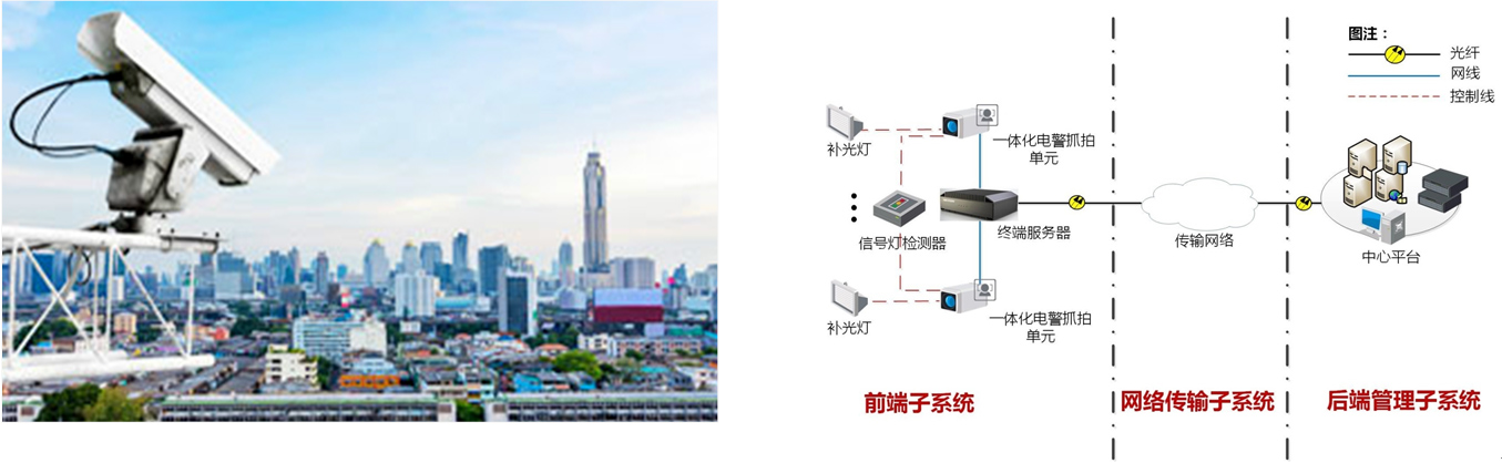 電子警察系統(tǒng)采用一體化集成設(shè)計(jì),攝像機(jī)內(nèi)集成視頻監(jiān)測(cè)、目標(biāo)跟蹤、違法判斷、圖片抓拍、車牌識(shí)別、數(shù)據(jù)存儲(chǔ)等功能,通過視頻分析方式實(shí)現(xiàn)對(duì)各種交通違法行為的監(jiān)測(cè)取證。對(duì)于違法取證數(shù)據(jù),可通過中心管理平臺(tái)進(jìn)行審核,審核確認(rèn)的違法數(shù)據(jù)可以上傳公安交通管理綜合應(yīng)用平臺(tái)(即"六合一"平臺(tái))違法數(shù)據(jù)庫(kù)進(jìn)行違法處理,從而規(guī)范城市通行秩序,改善城市交通環(huán)境。